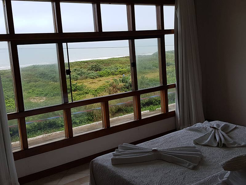 Suíte espaçosa e aconchegante com decoração romântica, perfeita para datas especiais. Possui cama confortável e armários espaçosos. A janela tem vista para o mar.